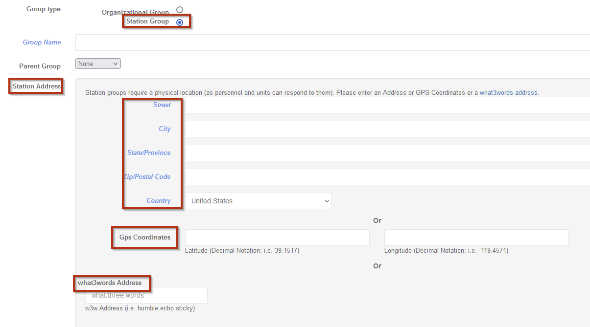 If you select a Station Group you need to fill in one of the address options, either a street address, GPS Coordinates (in decimal notation) or a what3words address.
